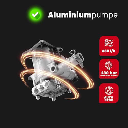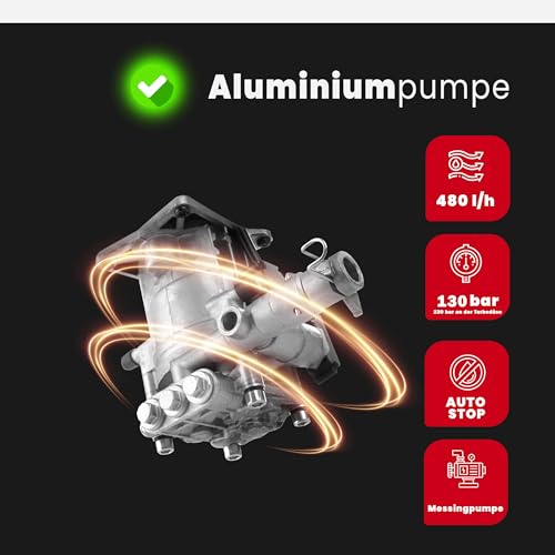 Die robuste Bauweise des Hochdruckreinigers wird hauptsächlich durch die Saug- und Druckpumpe aus Aluminium gewährleistet. Aluminium ist bekannt für seine Langlebigkeit und Korrosionsbeständigkeit, was im Einsatz mit Wasser von großem Vorteil ist.