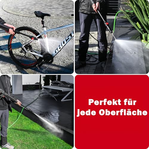 - Kommt mit umfangreichem Zubehörset: Terrassen- und Felgenbürsten, Schaumeinrichtung