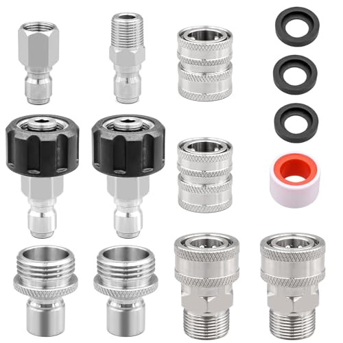 Bitte beachten: Der Innendurchmesser der M22-14 mm Drehgelenk-Schnellkupplung beträgt 14 mm, nicht 15 mm. Daher ist es nicht geeignet für elektrische Hochdruckreiniger mit M22 15mm Schnellkupplungen, Lieferumfang: Dieses 10er-Pack Hochdruckreiniger-Adapter-Set enthält 6 verschiedene Kupplungen: Metrisch M22-14 weiblich auf 3/8" Schnellkupplungsstecker, 3/8" Steckdose auf M22 männlich, 3/4" weiblich auf 1/2" Steckdose, 1/2" Stecker auf 3/4" männlich, 3/8" männlicher Stecker auf 3/8" NPT männlich, und 3/8" männlicher Stecker auf 3/8" NPT weiblich, Neues Upgrade: Unser Schnellkupplungsset für Hochdruckreiniger besteht aus Edelstahl und verbessertem Messing, was eine erhöhte Rostbeständigkeit und Haltbarkeit bietet. Es unterstützt Arbeitsdrücke von bis zu 5000psi. Mit fortschrittlicher Technologie und hochpräzisen Gewindeadaptern sorgt es für eine sichere und leckagefreie Verbindung, Einfache Installation: Die Schnellkupplungsstecker für Hochdruckreiniger sind für eine einfache manuelle Montage konzipiert. Diese Adaptersets und Stecker ermöglichen schnelle Verbindungen für Schläuche, Wasserpumpen, Kugelhähne, Teleskopstäbe und mehr, NPT-konform: Die 3/8" Schnellkupplungen entsprechen den NPT-Standards