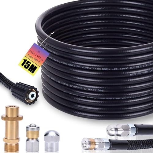 Rohrreinigungsschlauch Set 15m, 240 bar inkl. M22 Adapter, Düsen starr + rotierend für Kränzle Kärcher K2, K3, K4, K5, K6, K7 Hochdruckreiniger universal Rohrreinigungsset Hochdruckschlauch